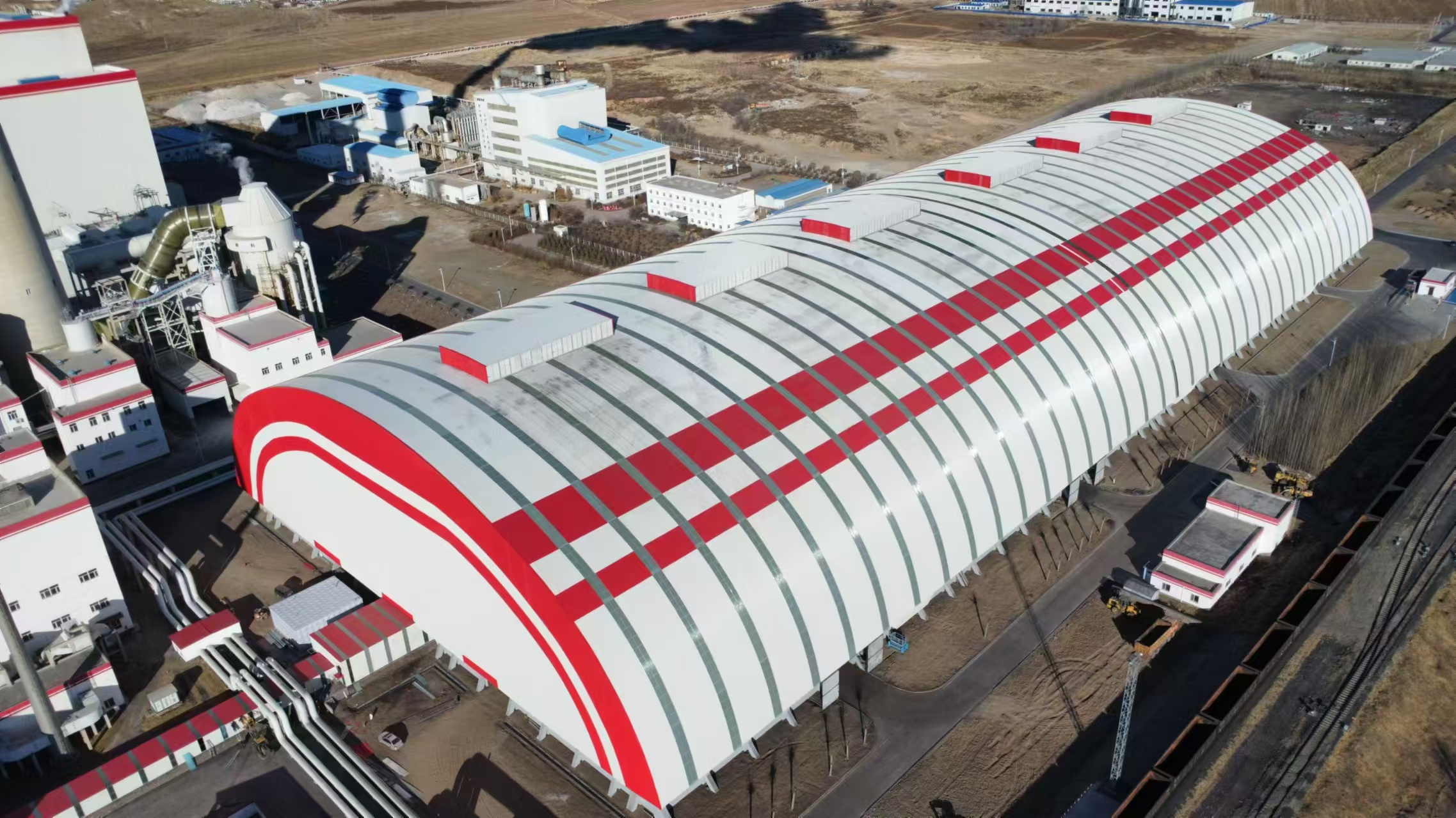 内蒙古京科发电有限公司科右中热电厂扩建工程封闭煤场PC工程跨度120m,长300m,宽120m,高30m,建筑面积36000㎡